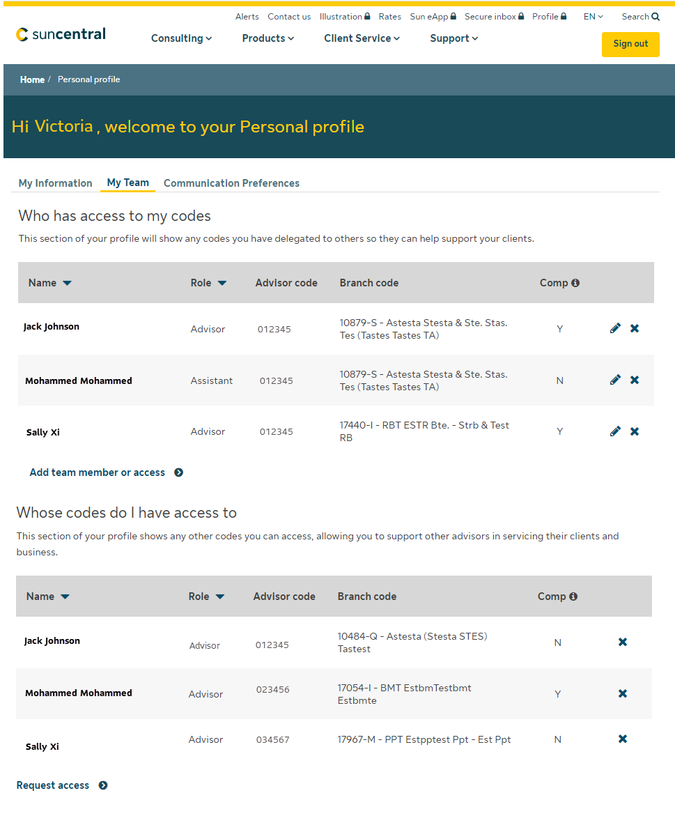 - an advisor can see which team member(s) have access to their selling codes and any team members whose codes they have access to, if applicable