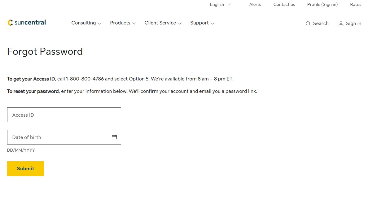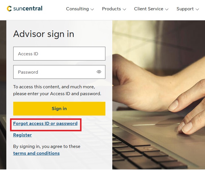 Step 1: Go to the reset password page or navigate to the Suncentral homepage and click on Forgot access ID or password